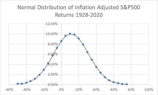 The chart below shows a normal distribution of the annual S&P 500 rates of return with the annual rate of return on the horizontal axis and the frequency of those rates of return on the vertical axis.