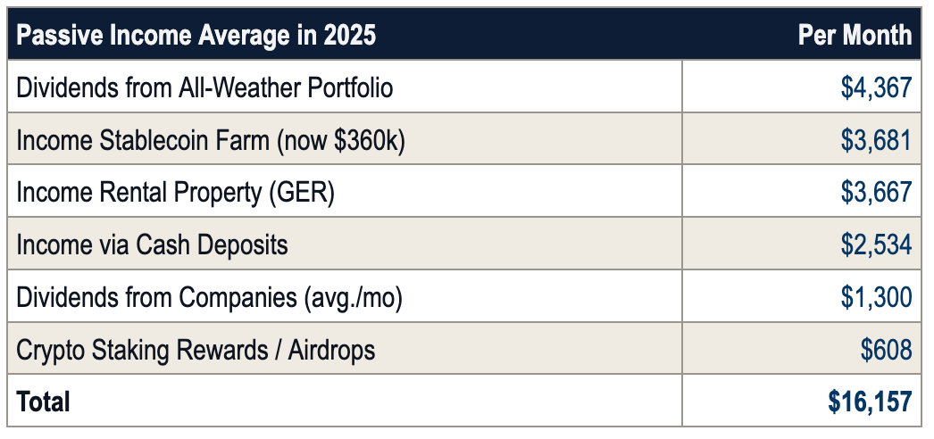 Every other dollar that comes in is passive. In 2025, I made $144k in the form of dividends from private companies, dividends from my stock portfolio, yields from stablecoins, staking rewards from digital assets, and some smaller income streams from real estate and other sources.