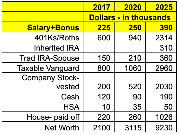 Really haven’t changed over the years, other than the accumulation of employer stock. All our non-employer stock assets are in one way or another in the stock market invested in low-cost index funds.