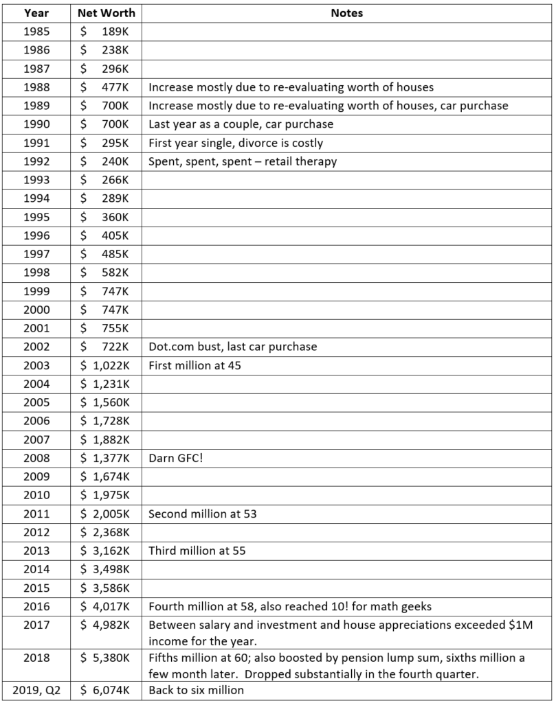 Our net worth accumulation was driven by earning good money, living within our means, carrying no debt (other than primary mortgage) and understanding the power of compounding interest.